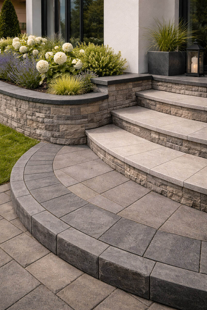 Folosind aceleași colecții ca pe fațadă (ROCK STONE, SLATE, BUCHARDIZED, WOOD etc.), obțineți o imagine arhitecturală unitară: casă, trepte, alei și forme mici care arată ca un proiect complet gândit.